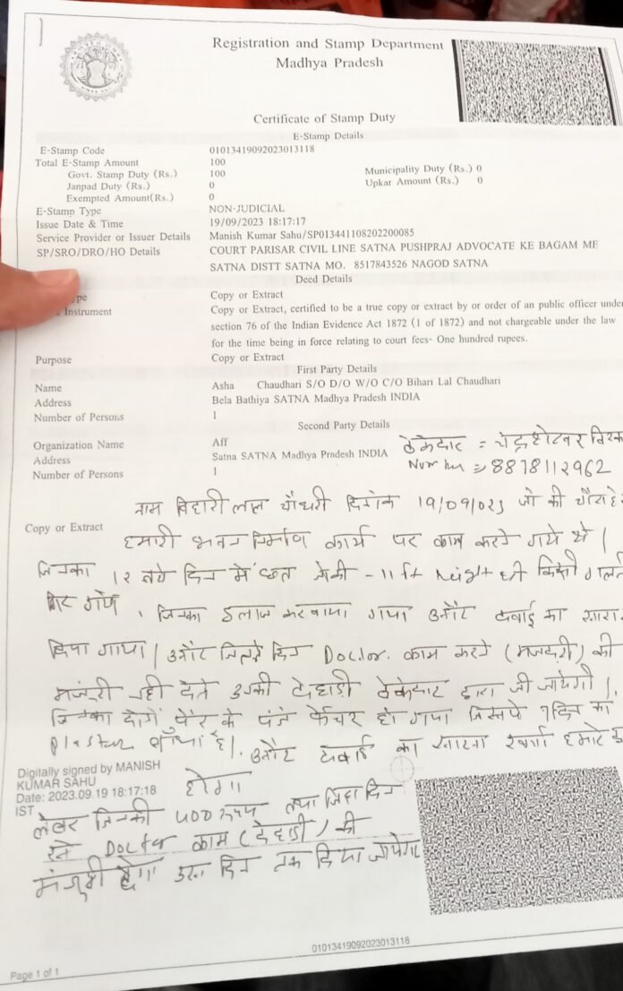 विगत दिनांक 19/9/2023 को ठेका मजदूर बिहारी लाल चौधरी उम्र 30 वर्ष पिता स्वर्गीय सौखीलाल चौधरी निवासी बेला बठीया पोस्ट संगमनिया सतना ठेकेदार चंद्रशेखर विश्वकर्मा के अंडर में लगभग कई दिनों से गल्ला मंडी के पीछे नई बस्ती टोस फैक्ट्री के बगल में दो मंजिला इमारत में काम कर रहे थे ठेकेदार द्वारा मजदूर बिहारी लाल चौधरी को छत के बगल में साइड में लगी हुई लकड़ी पकड़ कर खड़े होने के लिए कहा मजदूर द्वारा मना किया गया लेकिन ठेकेदार ने जबरदस्ती पूर्वक मजदूर को मजबूर किया गया जिससे कि मजदूर बिहारी लाल चौधरी का पांव छत से फिसल गया और वह 11 फीट ऊंचाई से नीचे जा गीरा जिससे कि मजदूर के पांव के दोनों पंजे फैक्चर हो गये एवं अन्य गंभीर चोटे आई हैं ठेकेदार द्वारा मजदूर को आश्वासन दिया गया कि जो भी दवाई में खर्च होगा हमारे द्वारा किया जाएगा और आप रिपोर्ट मत करना मजदूर ठेकेदार की चिकनी चुपड़ी बातों में आ गया लेकिन आज दिनांक तक ठेकेदार द्वारा मजदूर की कोई भी दवाई नहीं करवाई गई मजदूर अपने घर में कमाने वाला अकेला व्यक्ति ही था उसके पांव गंभीर रूप से फैक्चर हो जाने के कारण पूरा परिवार सड़क पर आ गया है और मजदूर के पिता पहले ही विगत वर्षों ही गुजर चुके हैं पीड़ित के परिजनों में गंभीर आरोप लगाया कि इस मामले की अगर उच्चस्तरीय जांच नहीं की गई तो हम लोग आमरण अनशन करने के लिए मजबूर हो जाएंगे !